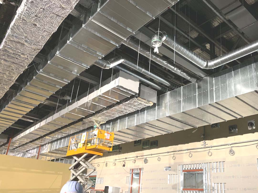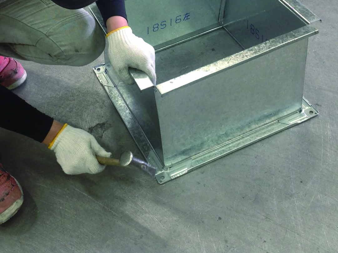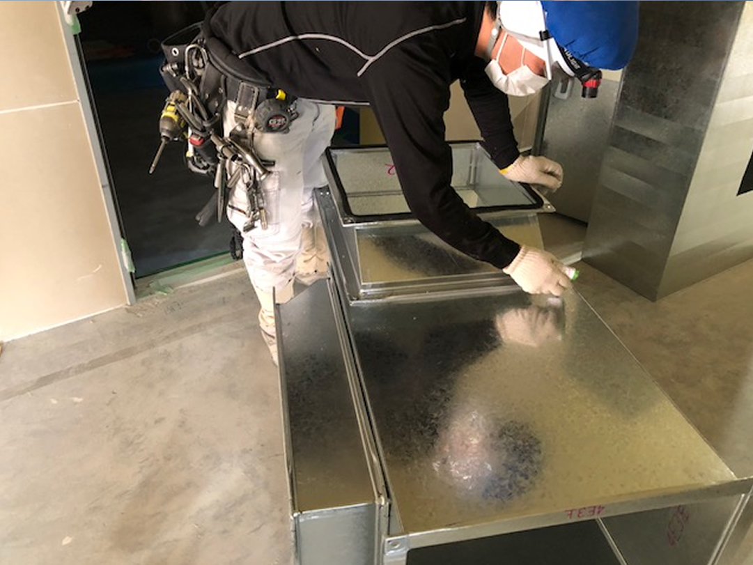 工場や学校、テナント、ビル、病院などが現場になります。ダクトの長さの調整、組立、加工を行い、吊りボルトなどでダクトを設置する流れとなります。